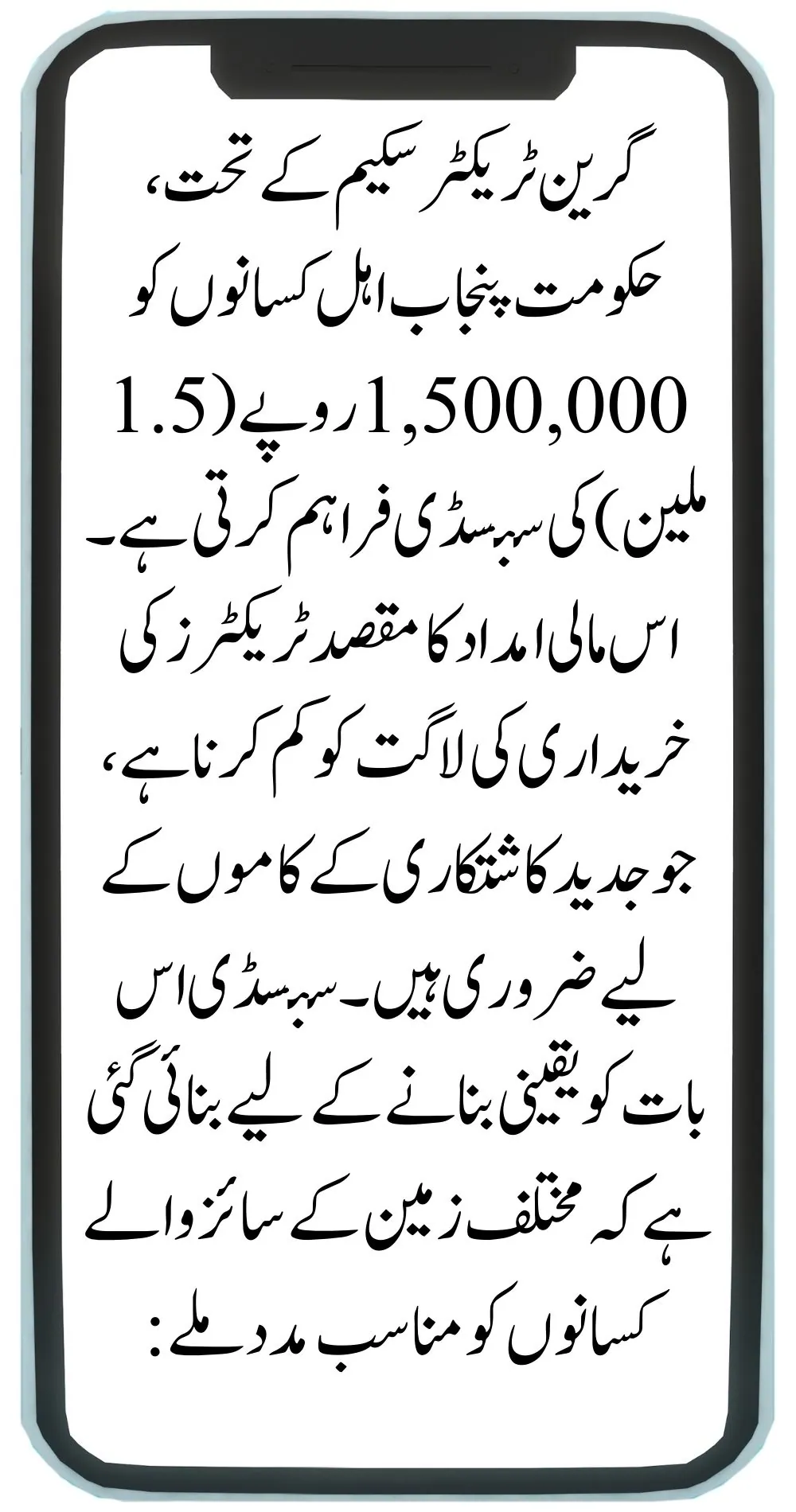 Under the Green Tractor Scheme, the Government of Punjab provides a subsidy of Rs 1,500,000 (1.5 million) to eligible farmers. This financial assistance is aimed at reducing the cost of purchasing tractors, which are essential for modern farming operations. The subsidy is structured to ensure that farmers with different land sizes receive appropriate support: