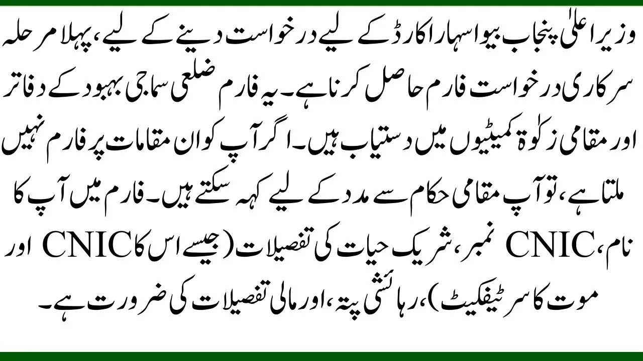To apply for the CM Punjab Bewa Sahara Card, the first step is to get the official application form. These forms are available at District Social Welfare Offices and local Zakat Committees. If you cannot find the form at these locations, you can ask local authorities for help.The form requires details such as your name, CNIC number, spouse’s details (like his CNIC and death certificate), residential address, and financial details.