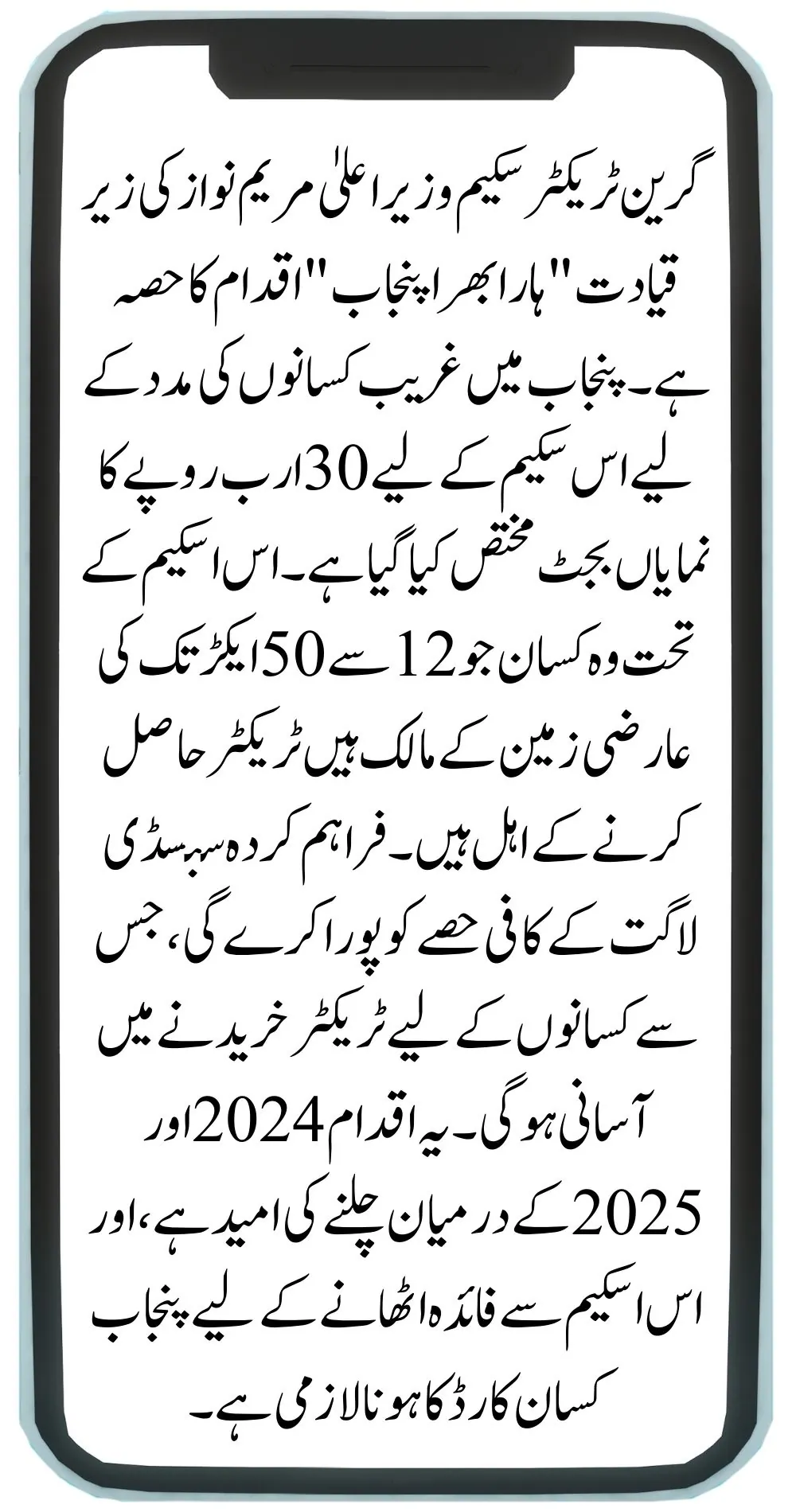 The Green Tractor Scheme is part of the “Hara Bhara Punjab” initiative led by Chief Minister Maryam Nawaz. A significant budget of Rs 30 billion has been allocated to this scheme to help poor farmers in Punjab. Under this scheme, farmers who own temporary land ranging from 12 to 50 acres are eligible to receive a tractor. The subsidy provided will cover a substantial part of the cost, making it easier for farmers to afford a tractor. This initiative is expected to run between 2024 and 2025, and having a Punjab Kisan Card is mandatory to benefit from this scheme.