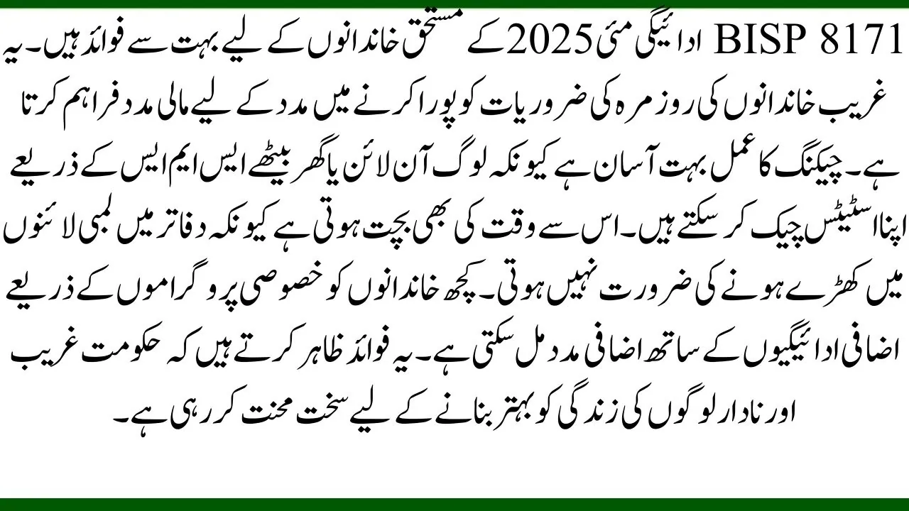The BISP 8171 Payment May 2025 has many benefits for deserving families. It provides financial support to help poor families meet their daily needs. The checking process is very easy because people can check their status online or by SMS from home. It also saves time as there is no need to stand in long lines at offices. Some families may receive extra support through special programs with increased payments. These benefits show that the government is working hard to make life better for poor and needy people.