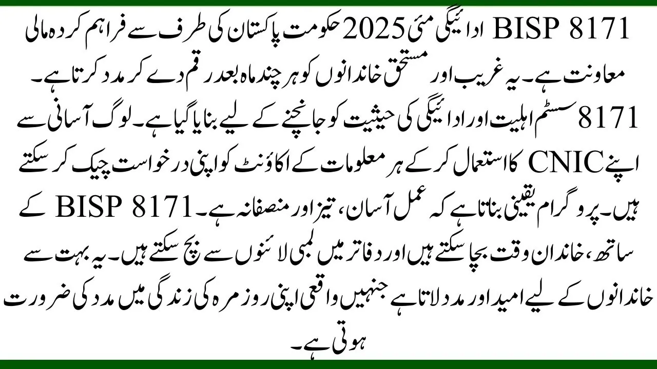 In this article, we are sharing all the details about the BISP 8171 Payment May 2025: Check Your CNIC Status and Payment Update. We explained what BISP 8171 is, how to check your payment online and by SMS, and common problems you might face. We also shared the benefits of the program and important tips to avoid mistakes. It is very important to keep your information updated and follow the correct steps. We hope this guide helps you to receive your payment easily and without any trouble. Stay informed and act on time.