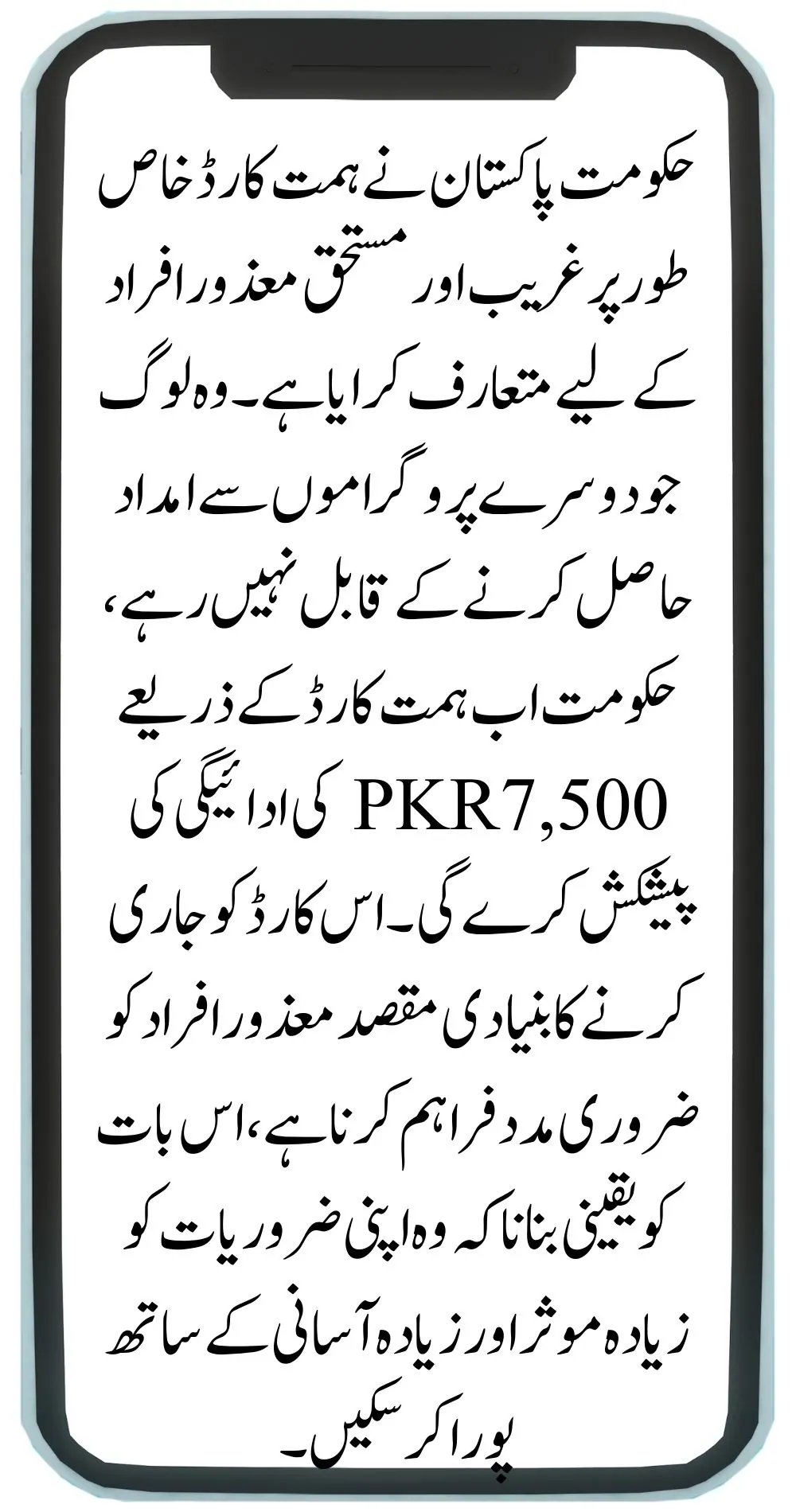 The Himmat Card provides eligible individuals with disabilities a monthly financial assistance of 7,500 PKR.