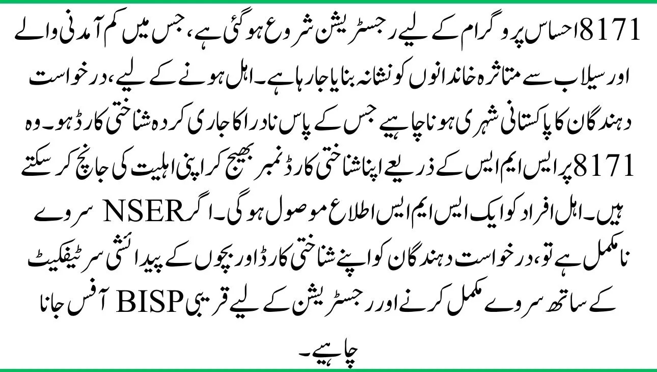Registration for the 8171 Ehsaas Program has started, targeting low-income and flood-affected families. To qualify, applicants must be Pakistani citizens with a NADRA-issued identity card. They can check their eligibility by sending their ID card number via SMS to 8171. Eligible individuals will receive an SMS notification. If the NSER survey is incomplete, applicants should visit the nearest BISP office with their identity card and children’s birth certificate to complete the survey and get registered.