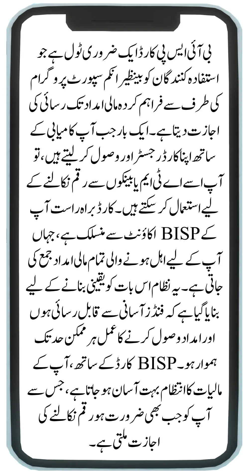 The BISP card is an essential tool that allows beneficiaries to access financial aid provided by the Benazir Income Support Program. Once you have successfully registered and received your card, you can use it to withdraw money from ATMs or banks. The card is linked directly to your BISP account, where all the financial aid you qualify for is deposited. This system is designed to ensure that the funds are easily accessible and that the process of receiving aid is as seamless as possible. With a BISP card, managing your finances becomes much easier, allowing you to withdraw funds whenever you need them.