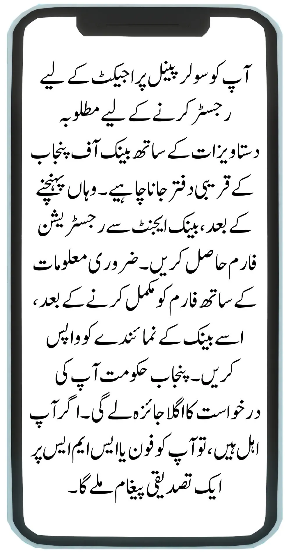 You must visit the closest Bank of Punjab office carrying the required documentation to register for the solar panel project. Once there, get the registration form from the bank agent. After completing the form with the necessary information, return it to the bank representative. The Punjab government will next review your application. Should you be qualified, you will get a confirmation message over the phone or SMS.
