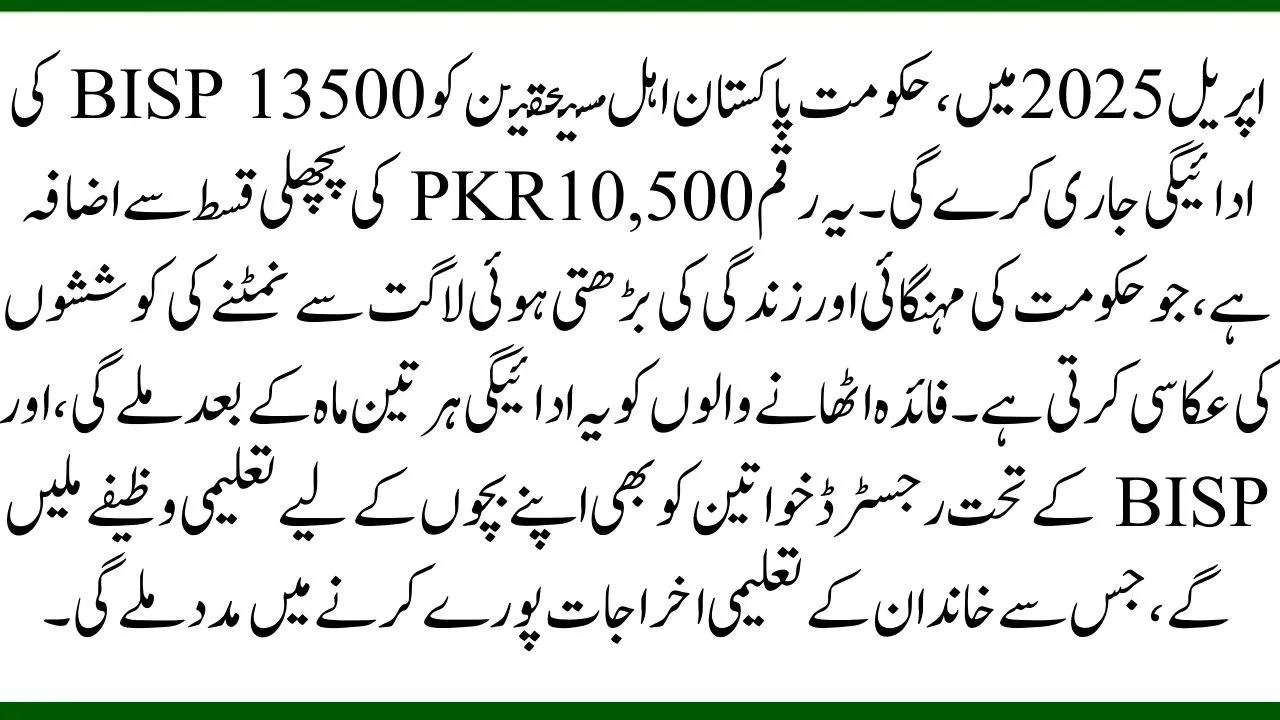 In April 2025, the Government of Pakistan will release the BISP 13500 payment to eligible beneficiaries. This amount is an increase from the previous installment of 10,500 PKR, reflecting the government’s effort to address inflation and the increasing cost of living. Beneficiaries will receive this payment after every three months, and women registered under BISP will also receive educational scholarships for their children, which helps meet the educational expenses of the family.