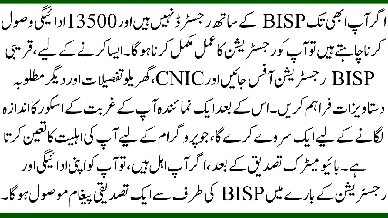 If you are not yet registered with BISP and want to receive 13500 payment, you must complete the registration process. To do so, visit nearest BISP registration office and provide CNIC, household details, and other required documents. A representative will then conduct a survey to assess your poverty score, which determines your eligibility for the program. After biometric verification, if you are eligible, you will receive a confirmation message from BISP about your payment and registration.