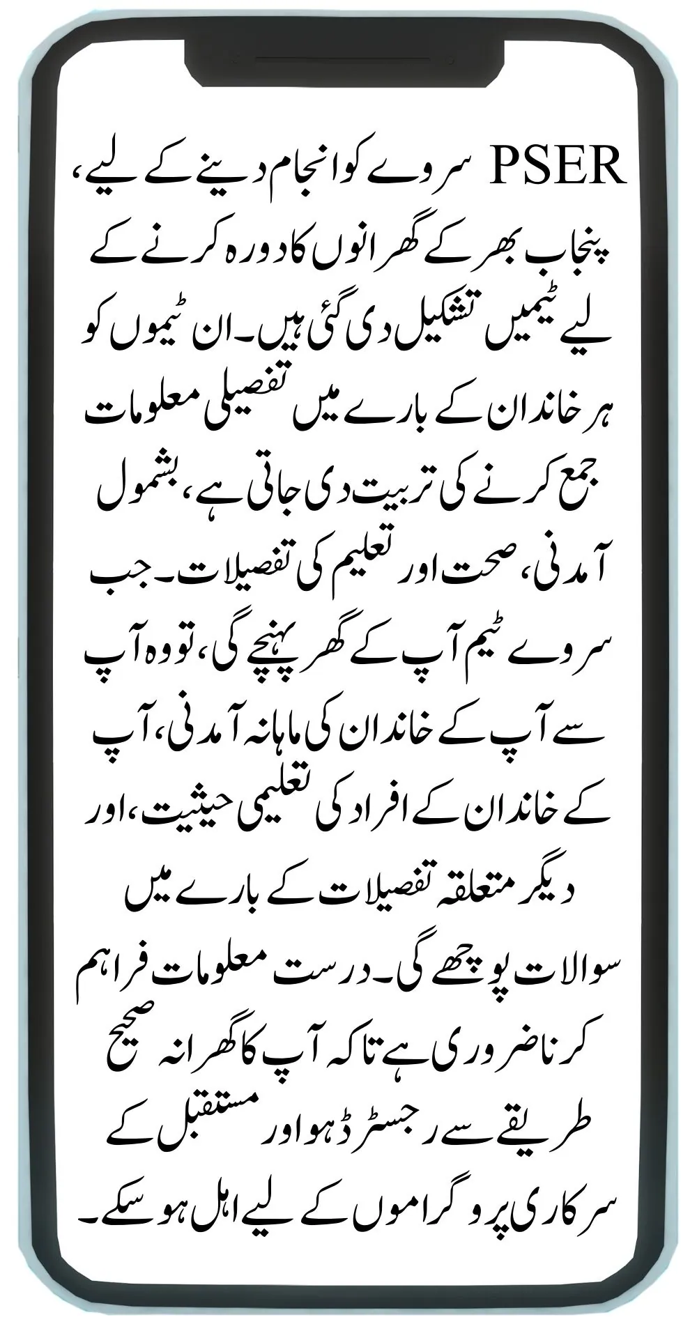 The primary goal of the PSER survey is to update and collect accurate data about households in Punjab. The previous system, known as NSER, had some inaccuracies, which resulted in some deserving families missing out on essential benefits. With the PSER survey, the government aims to gather precise information about family size, income levels, health status, and other important details. This data will help the government to plan better and allocate resources more efficiently, ensuring that social programs like financial aid, healthcare, and educational support reach those who need them most.