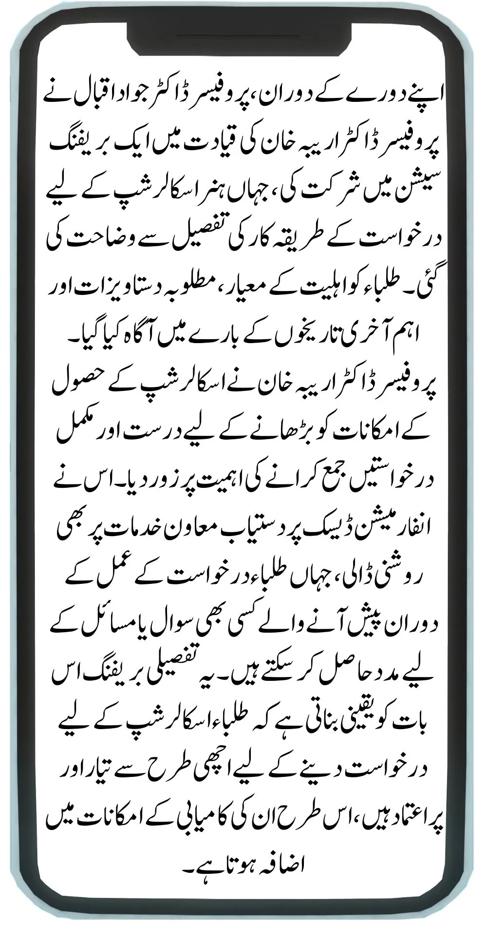 During his visit, Prof. Dr. Jawad Iqbal attended a briefing session led by Prof. Dr. Areeba Khan, where the application process for the Honhaar Scholarship was thoroughly explained. Students were informed about the eligibility criteria, required documents, and important deadlines. Prof. Dr. Areeba Khan emphasized the importance of submitting accurate and complete applications to increase the chances of receiving the scholarship. She also highlighted the support services available at the information desk, where students can seek assistance with any queries or issues they might encounter during the application process. This detailed briefing ensures that students are well-prepared and confident in applying for the scholarship, thereby enhancing their chances of success.