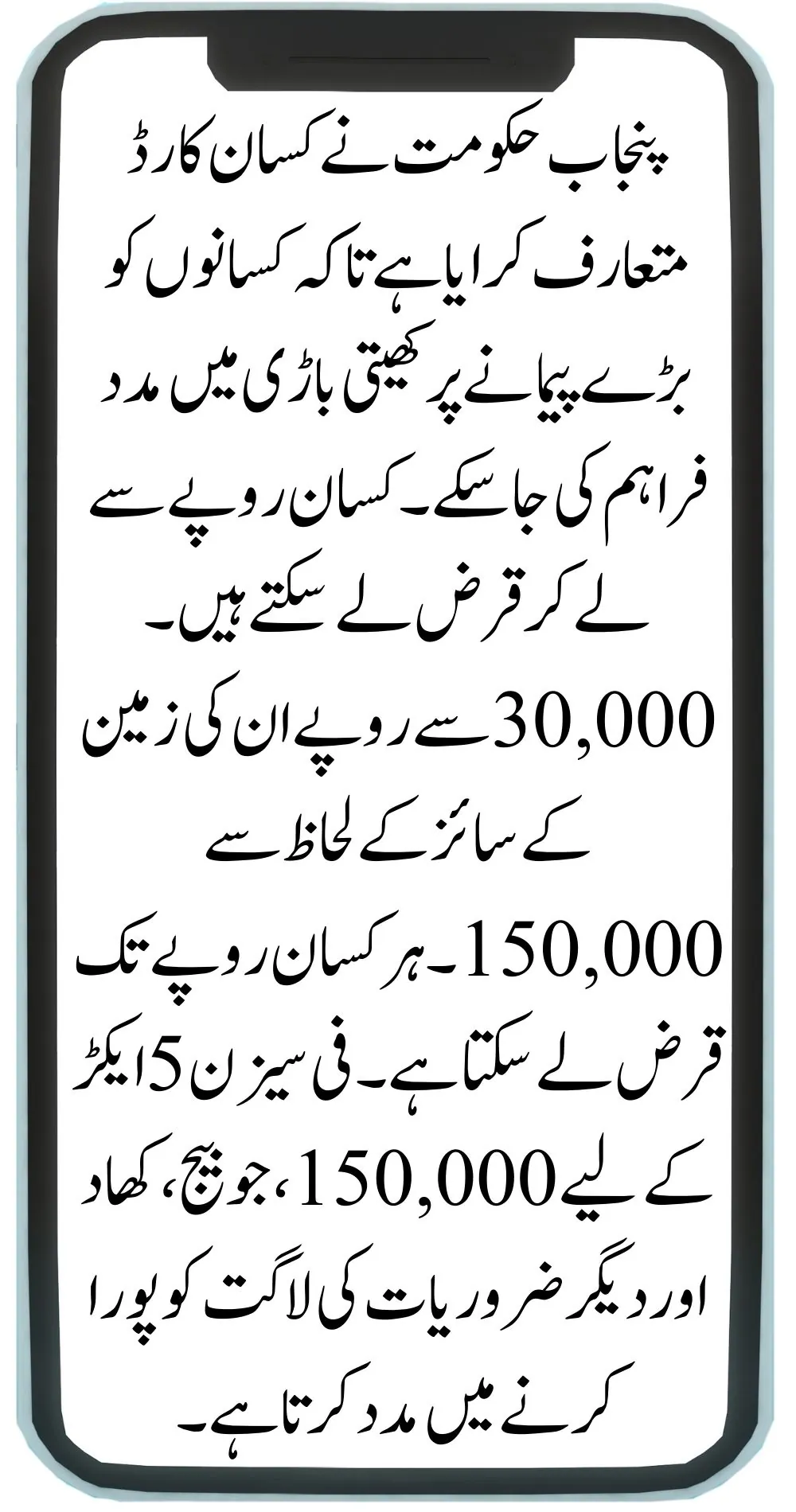 The Punjab Government has introduced the Kisan Card to help farmers with loans to support large-scale farming. Farmers can take loans ranging from Rs. 30,000 to Rs. 150,000 depending on their land size. Each farmer can borrow up to Rs. 150,000 for 5 acres per season, which helps cover the cost of seeds, fertilizers, and other necessities.