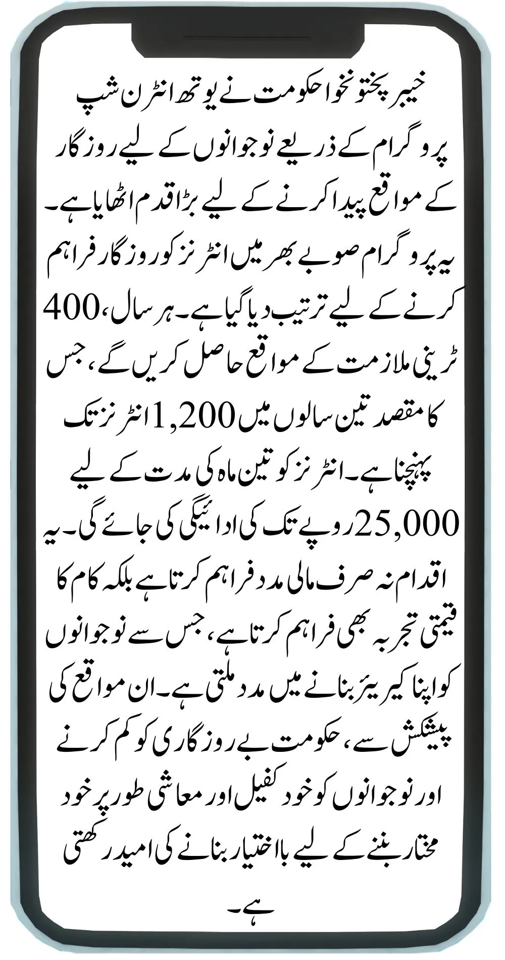The Khyber Pakhtunkhwa government has taken a major step to create jobs for young people through the Youth Internship Program. This program is set up to provide employment to interns across the province. Each year, 400 trainees will receive job opportunities, with the aim of reaching 1,200 interns over three years. The interns will be paid up to Rs 25,000 for a three-month period. This initiative not only provides financial support but also valuable work experience, helping young people build their careers. By offering these opportunities, the government hopes to reduce unemployment and empower the youth to become self-sufficient and economically independent.