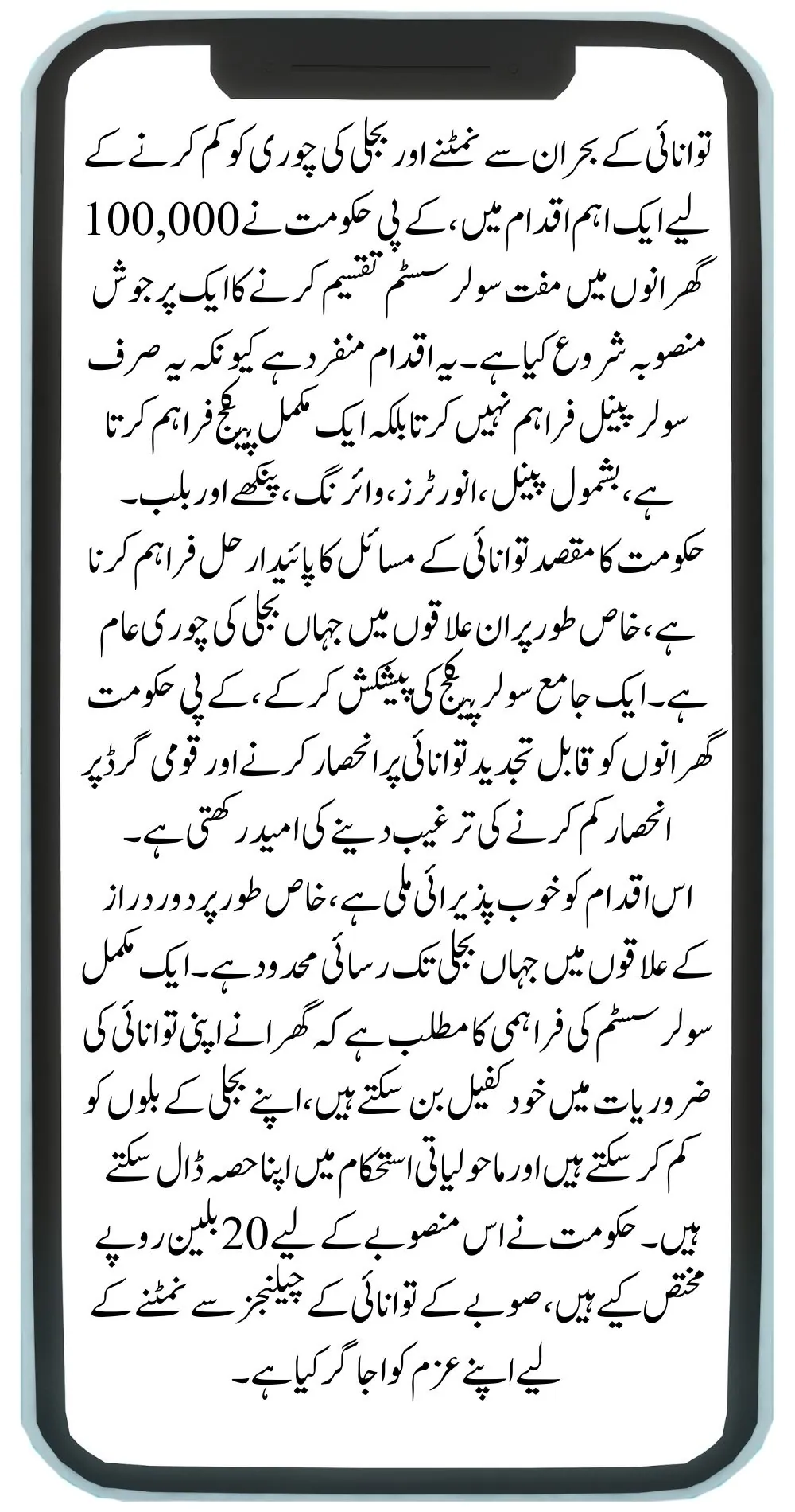 The initiative has been well-received, particularly in remote areas where access to electricity is limited. The provision of a complete solar system means that households can become self-sufficient in their energy needs, reducing their electricity bills and contributing to environmental sustainability. The government has allocated Rs20 billion for this project, underscoring its commitment to addressing the province’s energy challenges.