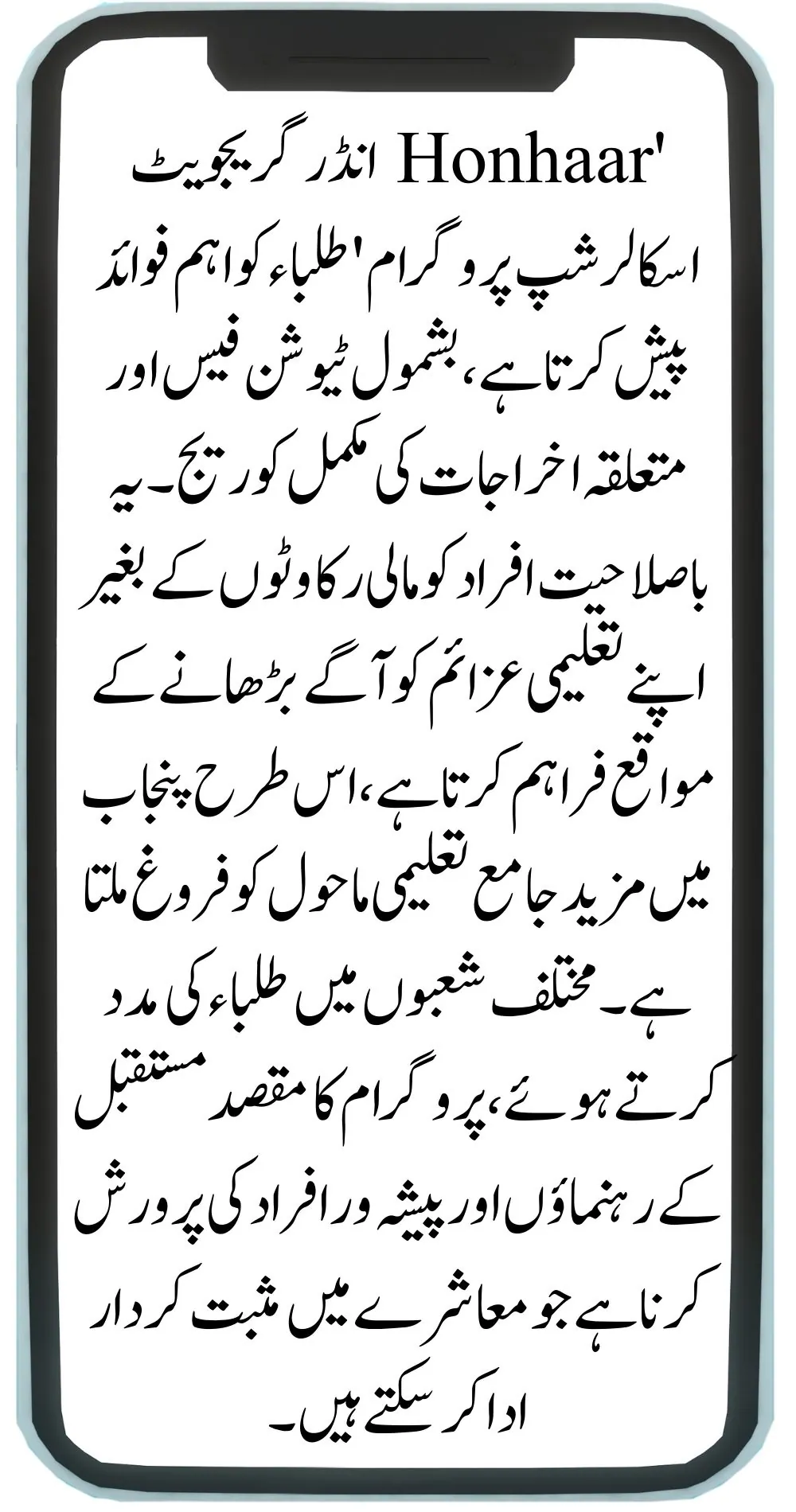 The ‘Honhaar Undergraduate Scholarship Programme offers significant benefits to students, including full coverage of tuition fees and related expenses. It provides opportunities for talented individuals to pursue their academic ambitions without financial constraints, thereby fostering a more inclusive educational environment in Punjab. By supporting students across various disciplines, the programme aims to nurture future leaders and professionals who can contribute positively to society.