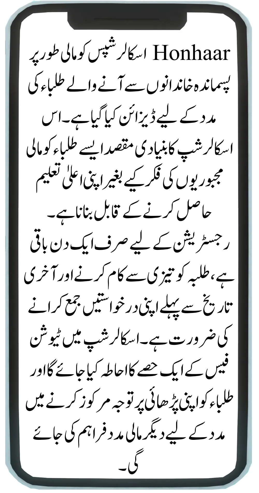 The Honhaar Scholarships are designed to support students who come from financially disadvantaged families. The primary goal of this scholarship is to enable such students to pursue their higher education without worrying about financial constraints. With just one day left for registration, students need to act fast and submit their applications before the deadline. The scholarship will cover a portion of the tuition fees and provide other financial assistance to help students focus on their studies.