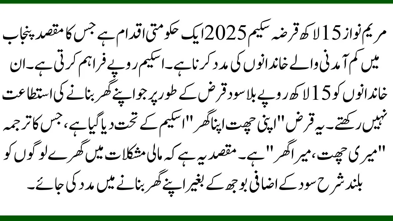 The Maryam Nawaz 15 Lakh Loan Scheme 2025 is a government initiative aimed at supporting low-income families in Punjab. The scheme provides Rs. 15 lakh as an interest-free loan to families who cannot afford to build their homes. The loan is given under the “Apni Chhat Apna Ghar” scheme, which translates to “My Roof, My Home.” The goal is to help people with financial difficulties build their houses without the added burden of high interest rates.