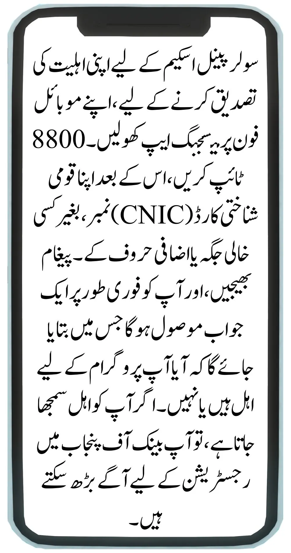 To verify your eligibility for the Solar Panel Scheme, open the messaging app on your mobile phone. Type 8800, followed by your National Identity Card (CNIC) number, without any spaces or additional characters. Send the message, and you will promptly receive a reply indicating whether you qualify for the program. If you are deemed eligible, you can then proceed to register at the Bank of Punjab.