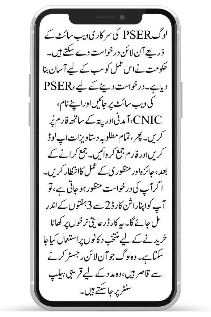 People can apply online through the official PSER website. The government has made the process easy for everyone. To apply, visit the PSER website and fill out the form with your name, CNIC, income, and address. Then, upload all the required documents and submit the form. After submission, wait for the review and approval process. If your application is approved, you will receive your Rashan Card within 2 to 3 weeks. This card can be used at selected shops to buy food at discounted rates. For those who are unable to register online, they can visit a nearby help center for assistance.