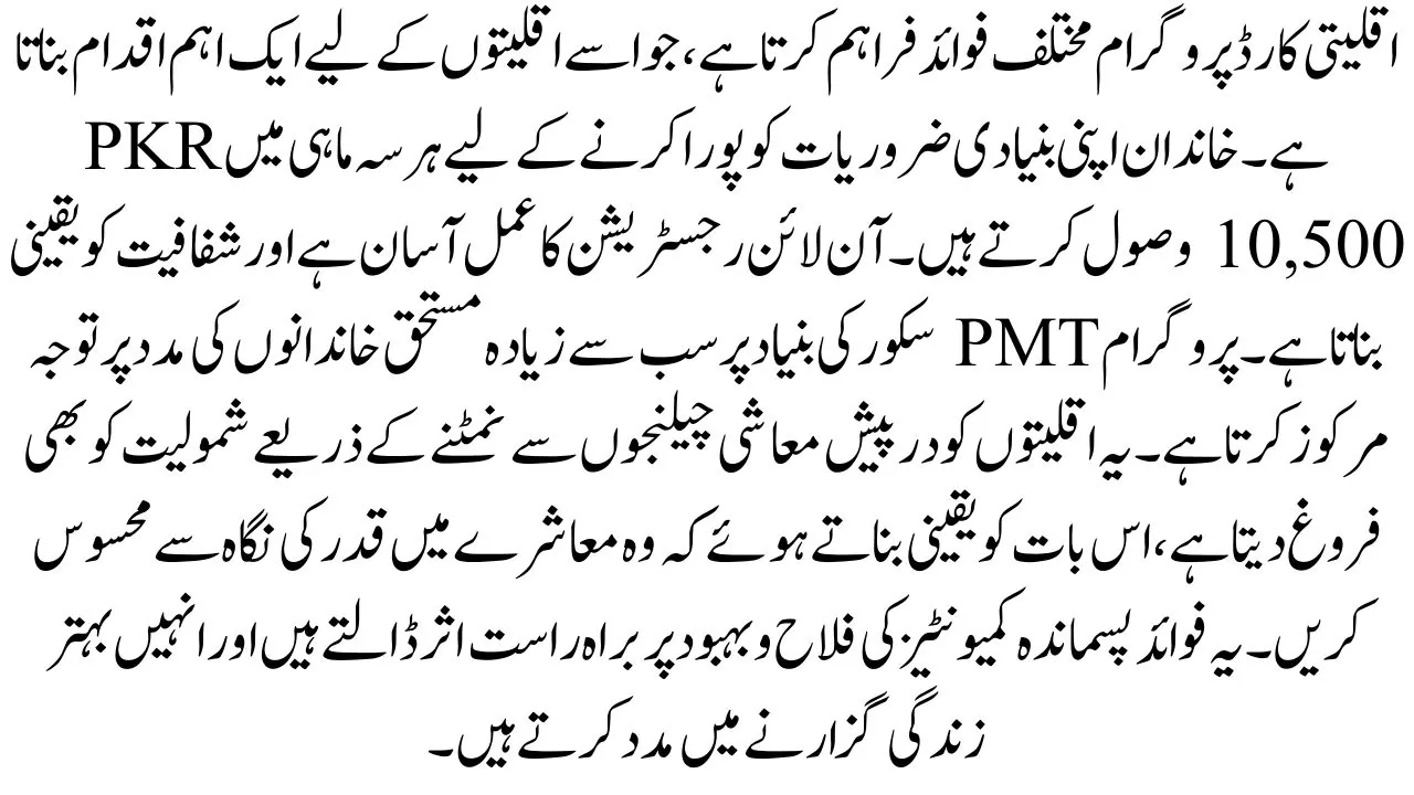 The Minority Card Program provides various benefits, making it a vital initiative for minorities. Families receive PKR 10,500 every quarter to support their basic needs. The online registration process is easy and ensures transparency. The program focuses on helping the most deserving families based on PMT scores. It also promotes inclusivity by addressing the economic challenges faced by minorities, ensuring they feel valued in society. These benefits directly impact the well-being of marginalized communities and help them lead better lives.