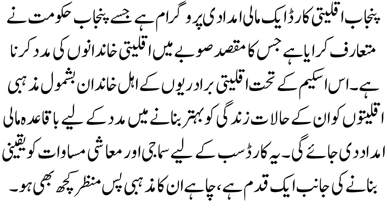 The Punjab Minority Card is a financial assistance program introduced by the Punjab government aimed at supporting minority families in the province. Under this scheme, eligible families from minority communities, including religious minorities, will receive regular financial aid to help improve their living conditions. The card is a step towards ensuring social and economic equity for all, regardless of their religious background.