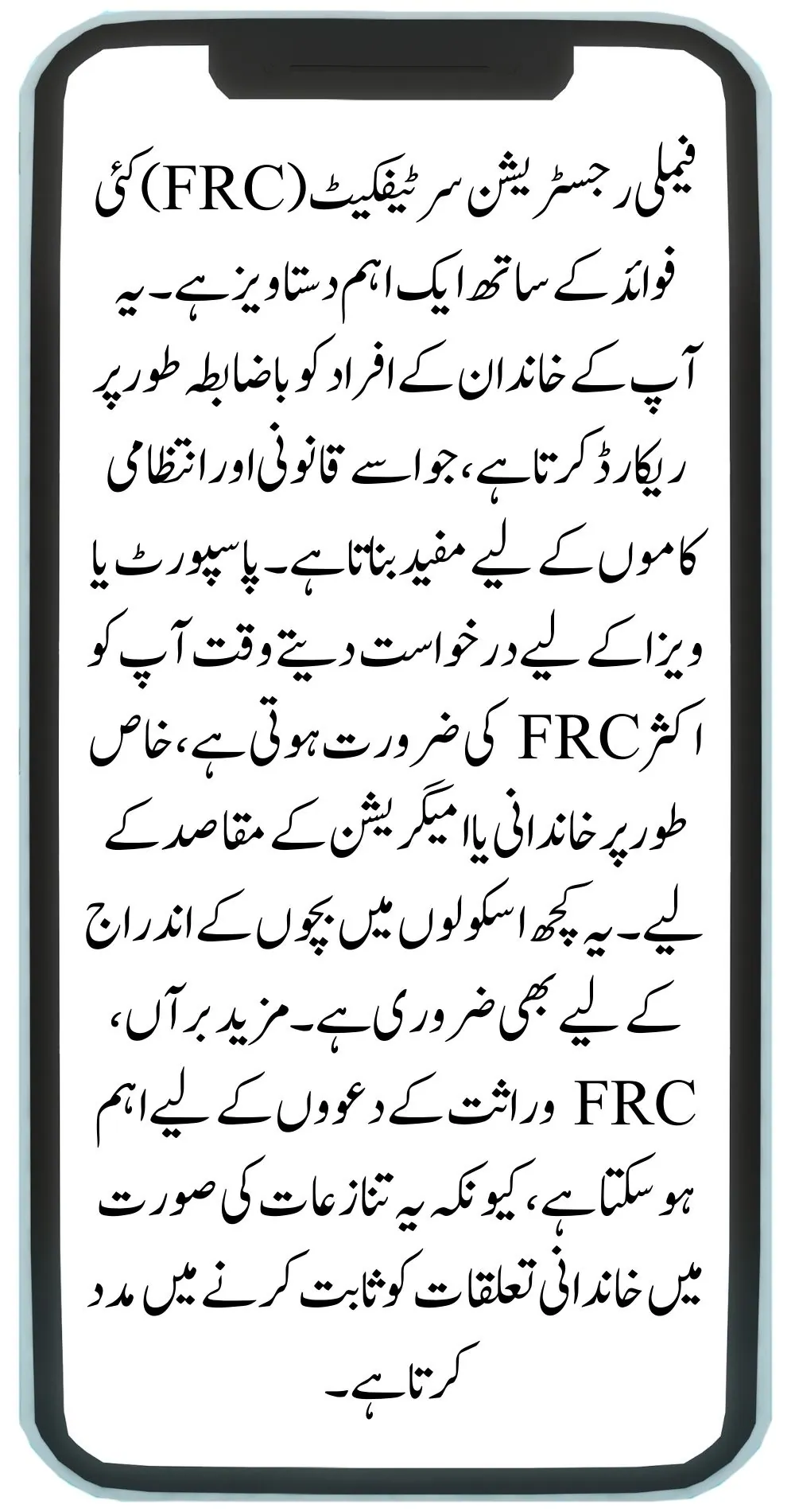 A Family Registration Certificate (FRC) is an official document issued by NADRA that lists all the members of a family. This document can be obtained in three different categories based on the relationship within the family: