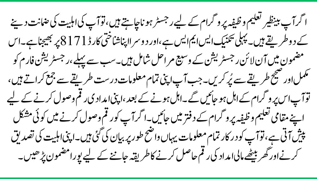 If you want to register for the Benazir Taleemi Wazifa program, there are two ways to guarantee your eligibility. The first technique is SMS, and the second is to send your CNIC to 8171. This article includes extensive steps for registering online. First, fill out the registration form completely and correctly. When you submit all of your information correctly, you will be eligible for this program. After becoming qualified, go to your local Taleemi Wazifa program office to receive your aid amount. If you have any difficulty receiving the money, all of the information you need is clearly described here. Read the entire article to learn how to confirm your eligibility and receive financial aid money at home.
