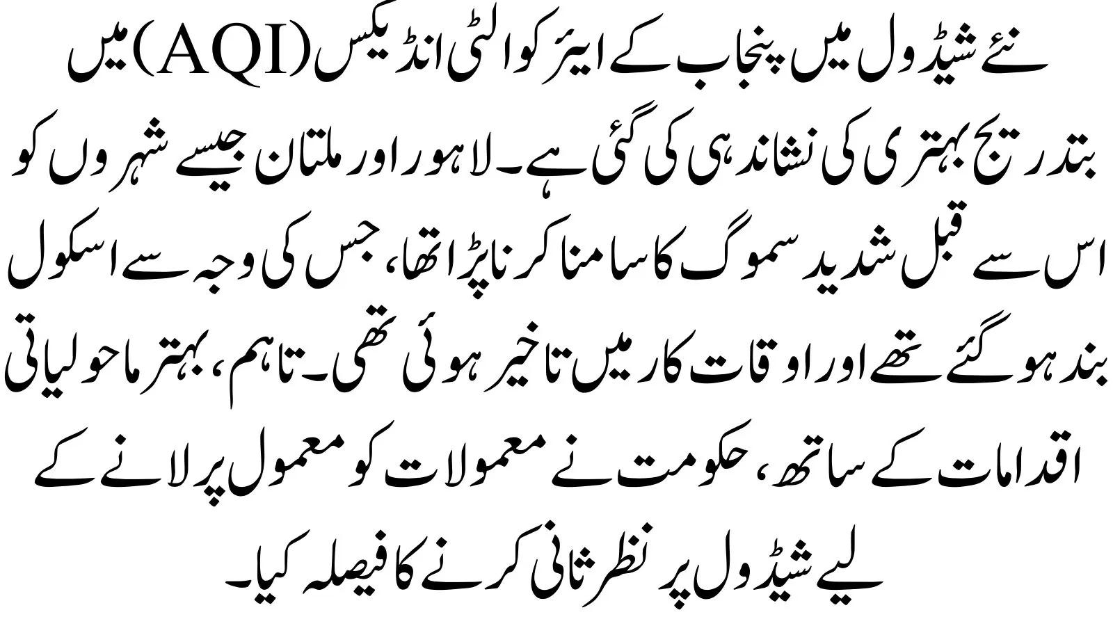The new schedule addresses the gradual improvement in Punjab’s Air Quality Index (AQI). Cities like Lahore and Multan had previously faced severe smog, prompting school closures and delayed timings. However, with enhanced environmental measures, the government decided to revise the schedule to normalize routines.