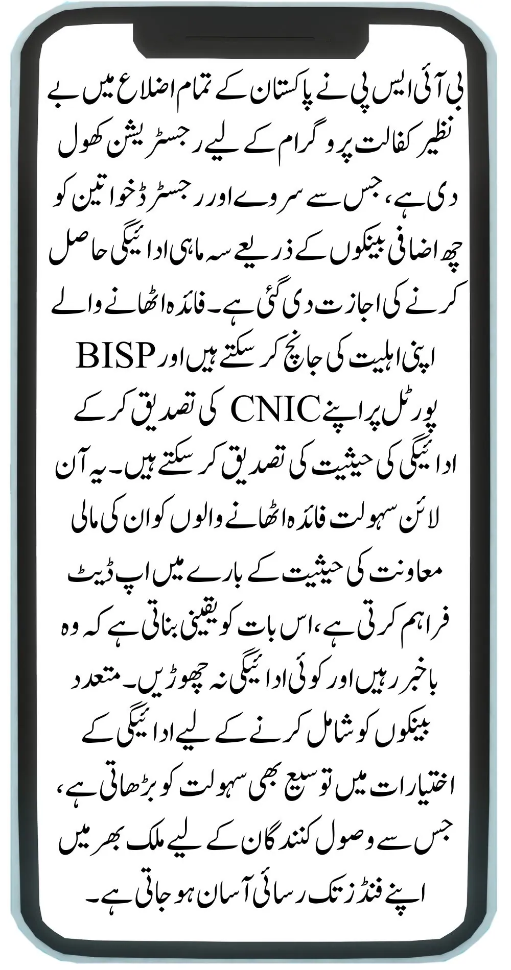 The BISP has opened registration for the Benazir Kafalat Program in all districts of Pakistan, allowing women who have been surveyed and registered to receive their quarterly payment through six additional banks. Beneficiaries can check their eligibility and confirm payment status by verifying their CNIC on the BISP portal. This online facility provides beneficiaries with updates on their financial support status, ensuring they stay informed and do not miss any payments. The expansion of payment options to include multiple banks also enhances convenience, making it easier for recipients to access their funds across the country.