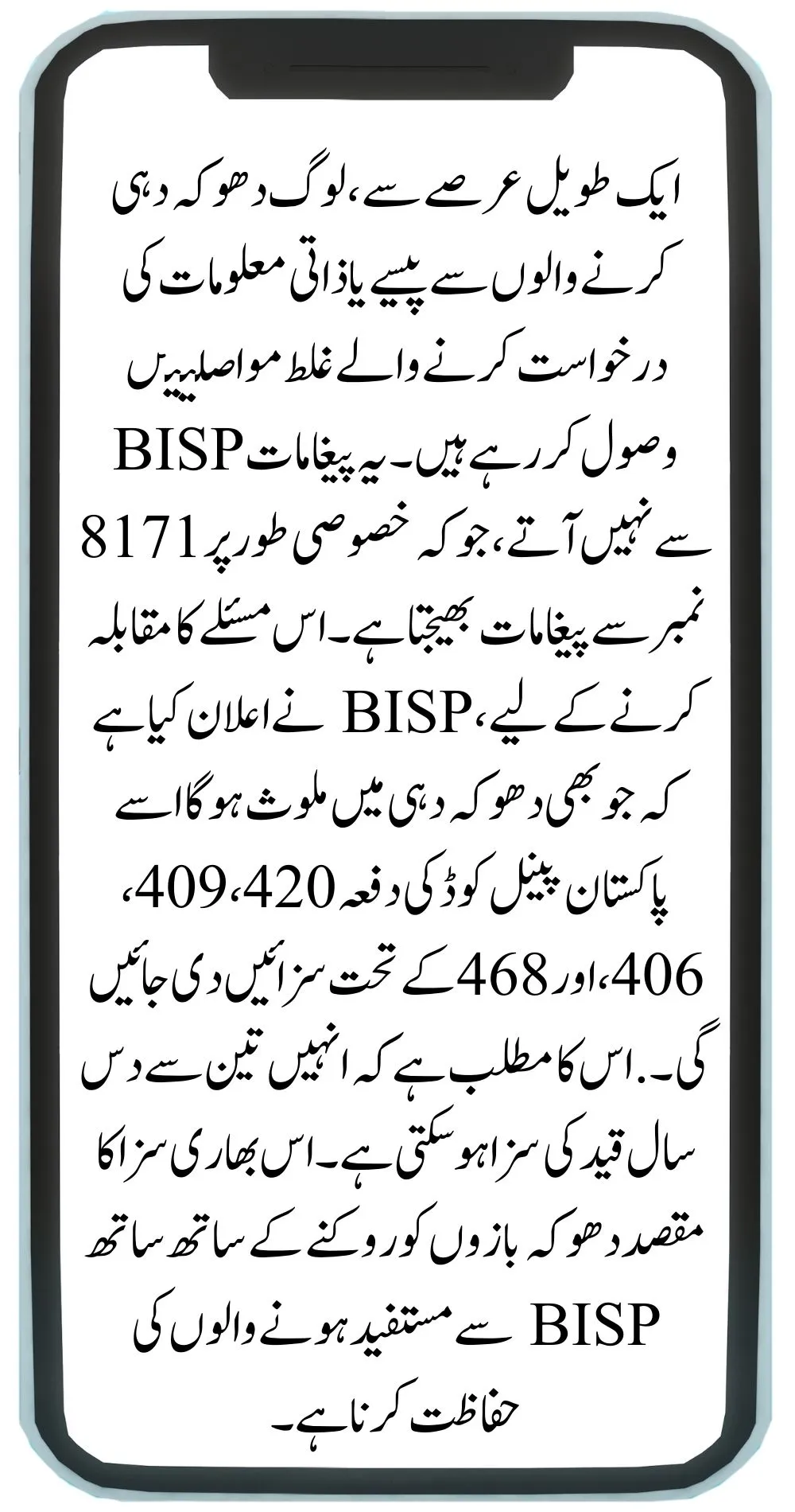 For a long time, individuals have been receiving false communications from scammers requesting money or personal information. These messages do not originate from the BISP, which exclusively sends messages from the number 8171. To counteract this issue, the BISP has announced that anyone engaging in fraud will face penalties under Sections 420, 409, 406, and 468 of the Pakistan Penal Code. This means they might face three to ten years in prison. This hefty punishment is intended to dissuade scammers while also protecting BISP beneficiaries.