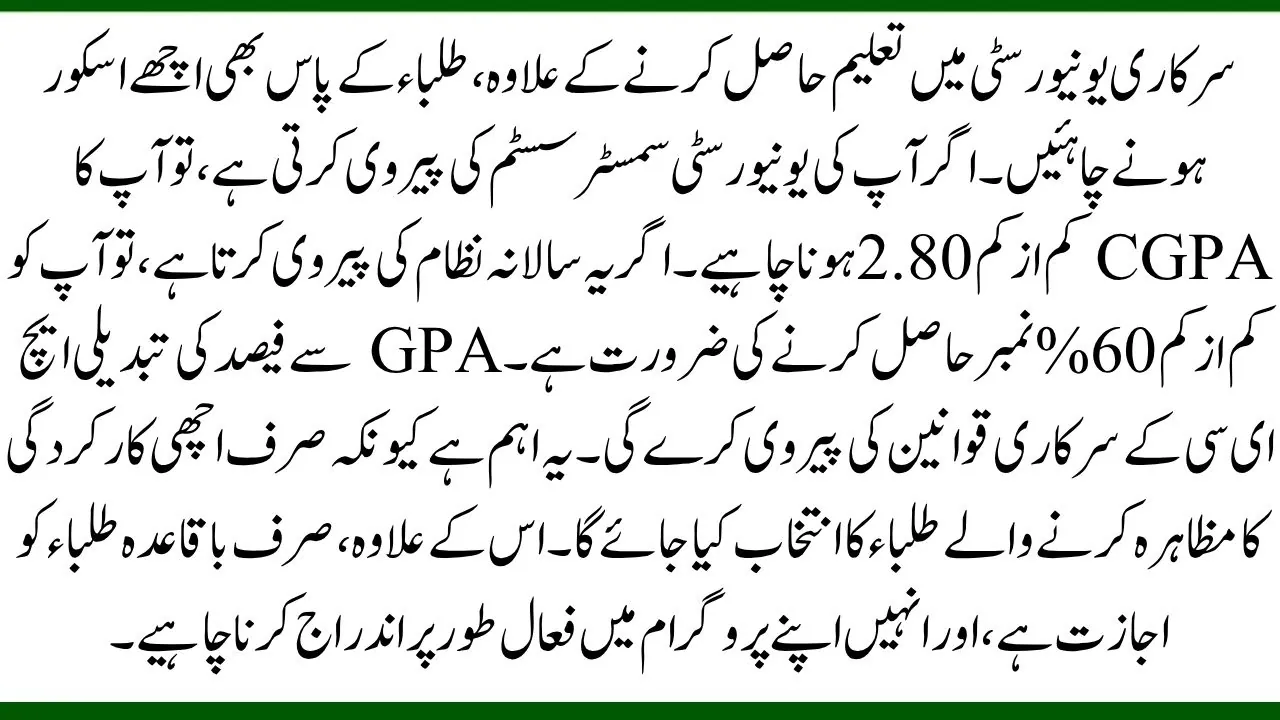 Other than studying in a public university, students must also have a good score. If your university follows the semester system, your CGPA must be at least 2.80. If it follows the annual system, you need to have at least 60% marks. The GPA to percentage conversion will follow the official rules of HEC. This is important because only students who perform well will be selected. Also, only regular students are allowed, and they must be actively enrolled in their program.