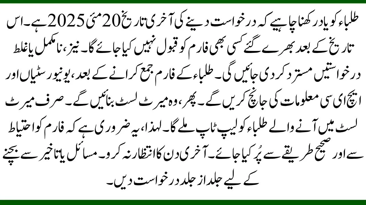 Students should remember that the last date to apply is May 20, 2025. Any forms filled after this date will not be accepted. Also, incomplete or wrong applications will be rejected. After students submit their forms, the universities and HEC will check the information. Then, they will create a merit list. Only students on the merit list will get laptops. So, it is important to fill the form carefully and correctly. Do not wait for the last day; apply as soon as possible to avoid problems or delays.