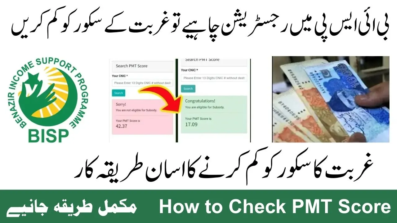 You can check your PMT score by visiting the official BISP or Ehsaas website, using the SMS service, or by visiting an Ehsaas or BISP center.