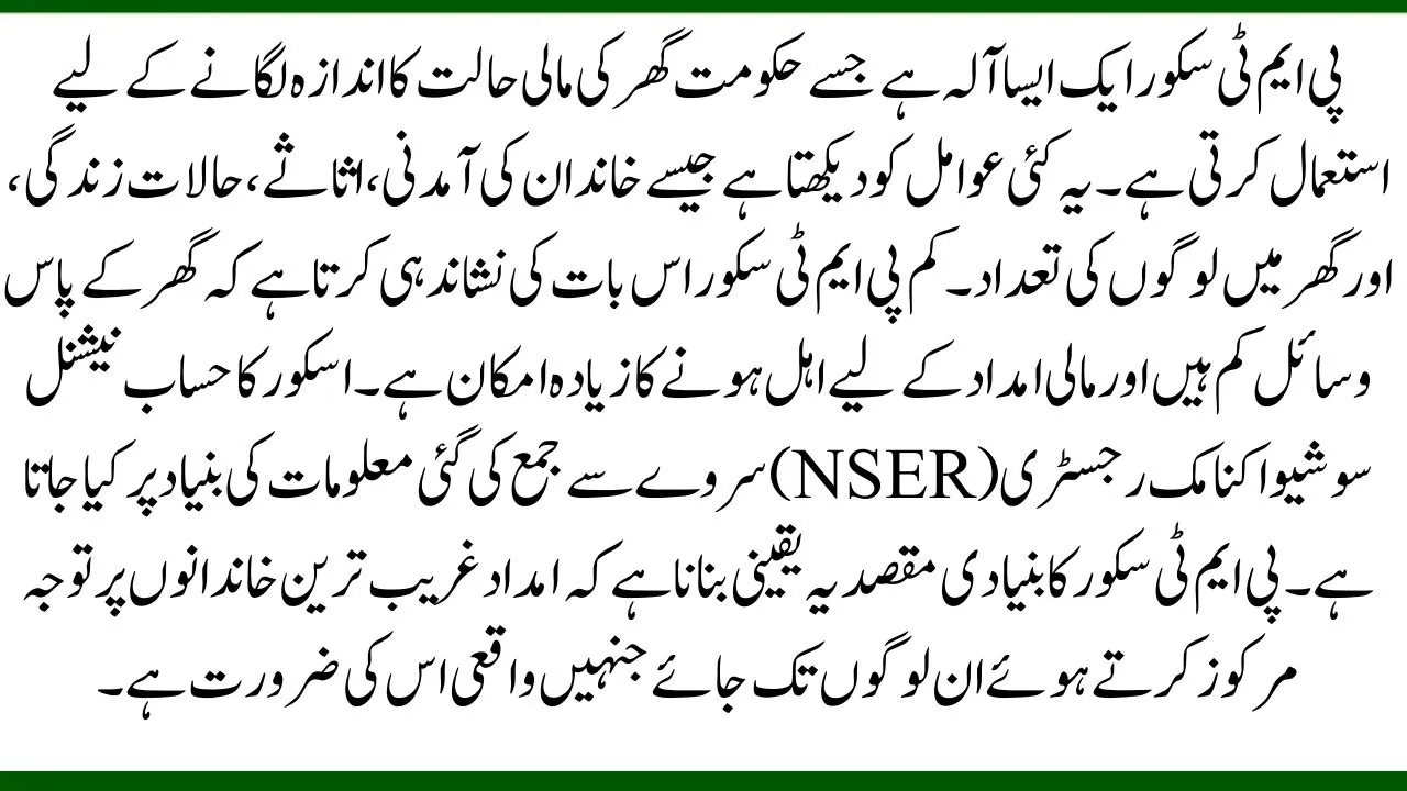 The PMT score is a tool the government uses to assess a household’s financial situation. It looks at several factors such as family income, assets, living conditions, and the number of people in the household. A low PMT score indicates that the household has fewer resources and is more likely to qualify for financial assistance. The score is calculated based on information collected from the National Socio-Economic Registry (NSER) survey. The main goal of the PMT score is to ensure that aid goes to those who truly need it, focusing on the poorest families.