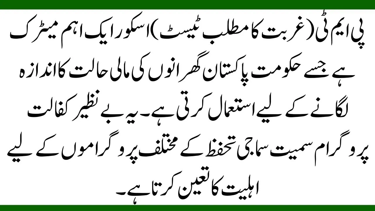 The PMT (Poverty Means Test) score is a critical metric used by the Government of Pakistan to assess the financial condition of households. It determines eligibility for various social protection programs, including the Benazir Kafaalat Program.