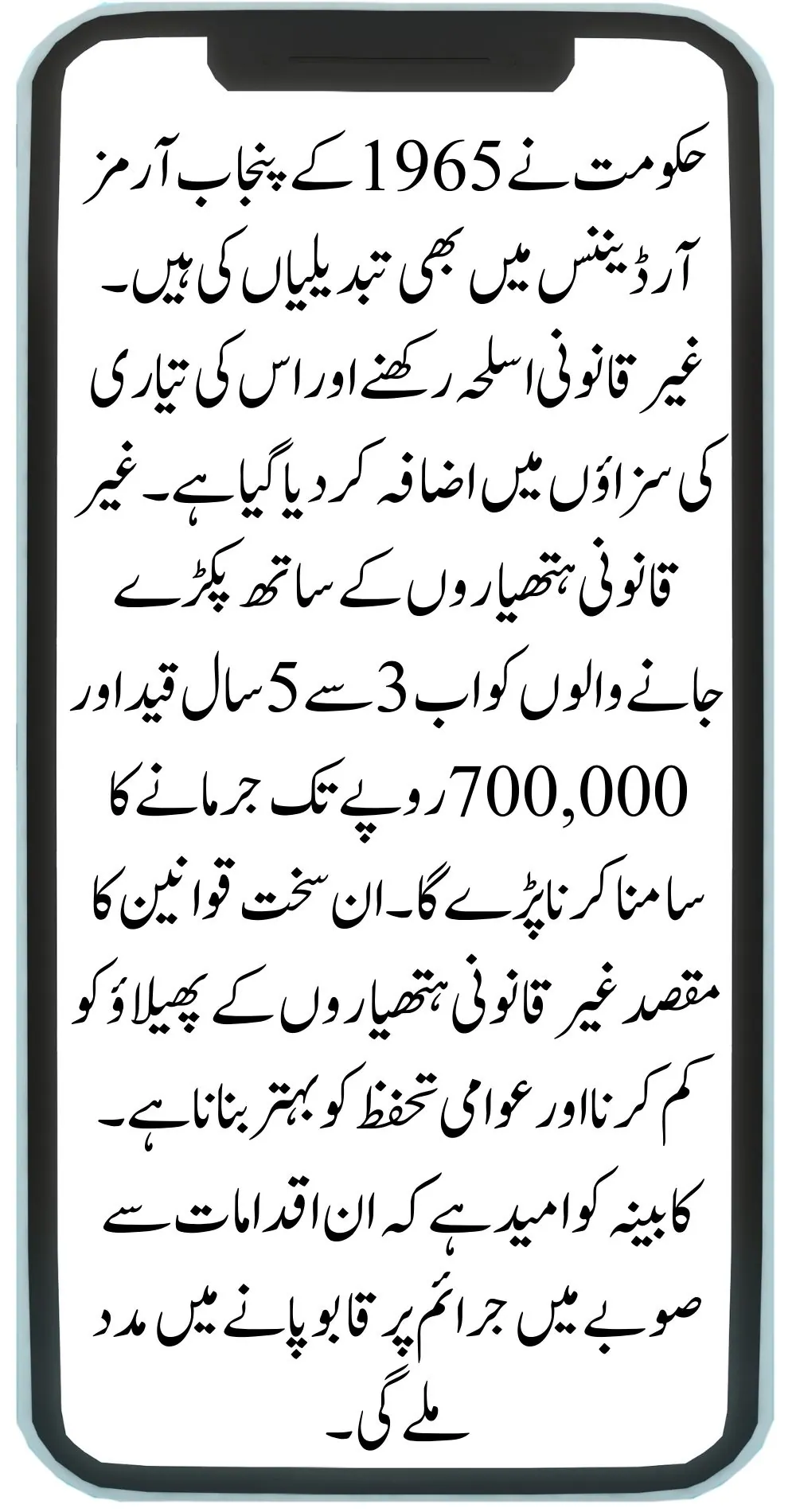 The government has also made changes to the Punjab Arms Ordinance of 1965. The penalties for illegal possession and manufacture of weapons have been increased. Those caught with illegal weapons will now face 3 to 5 years in prison, along with fines of up to 700,000 rupees. These stricter rules are aimed at reducing the spread of illegal weapons and improving public safety. The cabinet hopes that these measures will help control crime in the province.