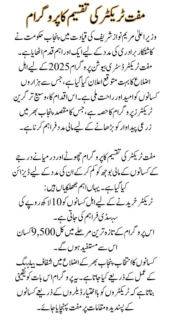 The Punjab government, under the leadership of Chief Minister Maryam Nawaz Sharif, has taken another significant step to support the farming community. The much-anticipated announcement of districts eligible for the Free Tractor Distribution Program 2025 has been made, bringing hope and relief to thousands of farmers. This initiative, part of the broader Green Tractors Program, aims to provide financial assistance to boost agricultural productivity across Punjab.