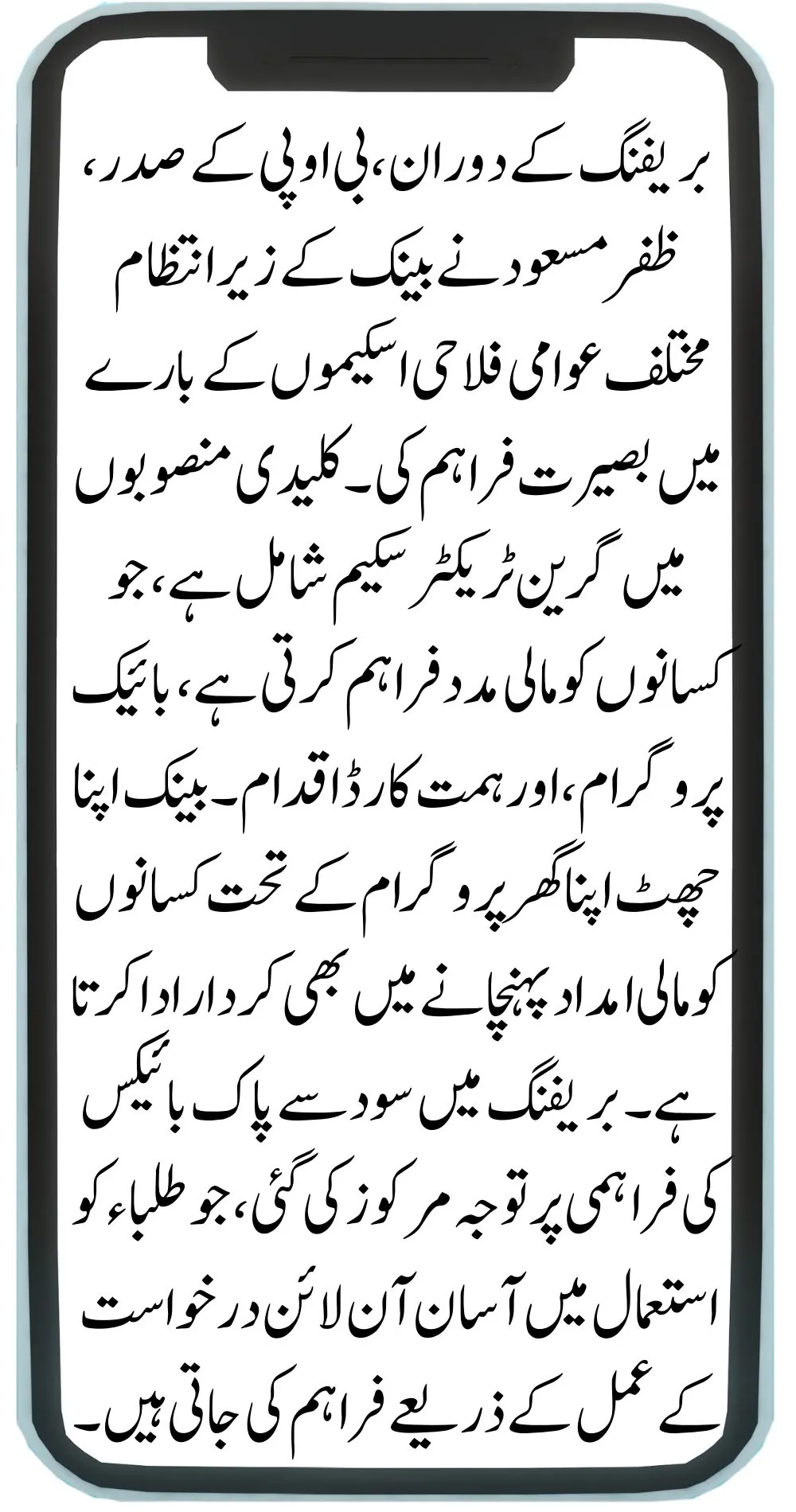 During the briefing, Zafar Masood, the president of BoP, provided insights into various public welfare schemes managed by the bank. Key projects include the Green Tractor Scheme, which offers financial support to farmers, the Bike Program, and the Himmat Card initiative. The bank also plays a role in delivering financial assistance to farmers under the Apni Chhat Apna Ghar program. The briefing focused on the delivery of interest-free bikes, which are provided to students through an easy-to-use online application process.