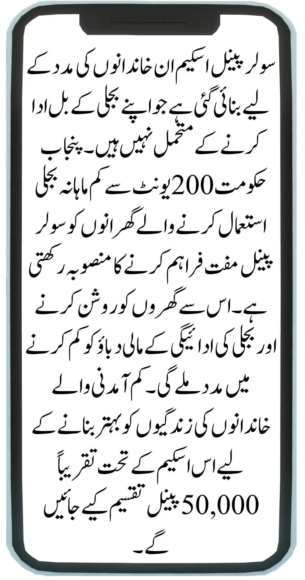 The solar panel scheme is designed to support families who cannot afford to pay their electricity bills. The Punjab Government plans to provide solar panels free of cost to households with monthly electricity consumption under 200 units. This will help light up homes and reduce the financial stress of paying for electricity. Around 50,000 panels will be distributed under this scheme to improve the lives of low-income families.