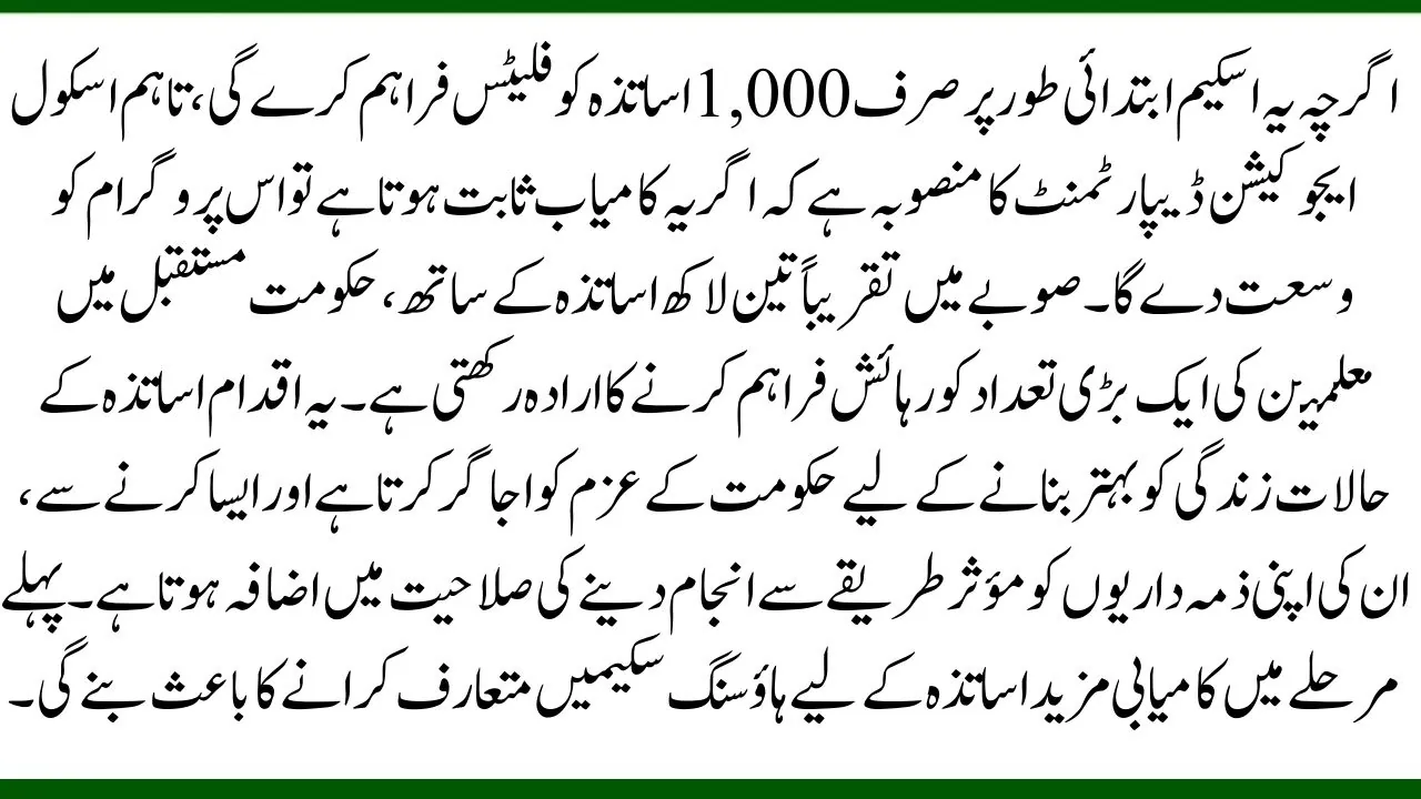 - Under this housing scheme, teachers will be provided with flats in a way that eases their financial burden.