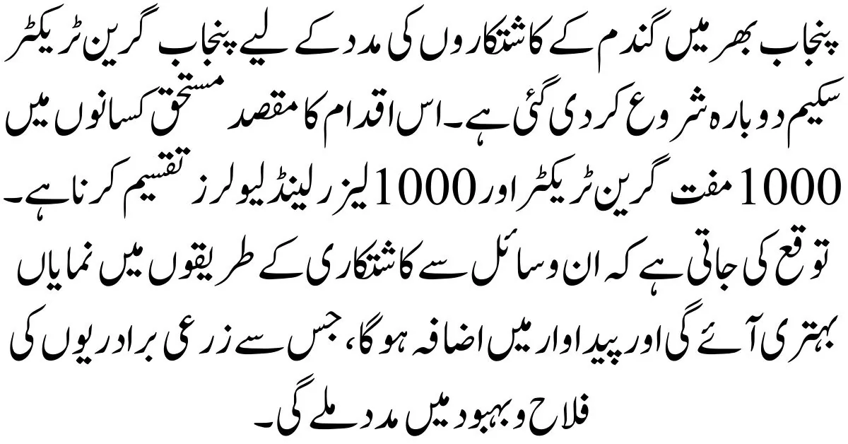 The Punjab Green Tractor Scheme has been resumed to support wheat cultivators across Punjab. This initiative aims to distribute 1000 free green tractors and 1000 laser land levelers among deserving farmers. These resources are expected to significantly improve farming practices and increase yields, contributing to the welfare of agricultural communities.