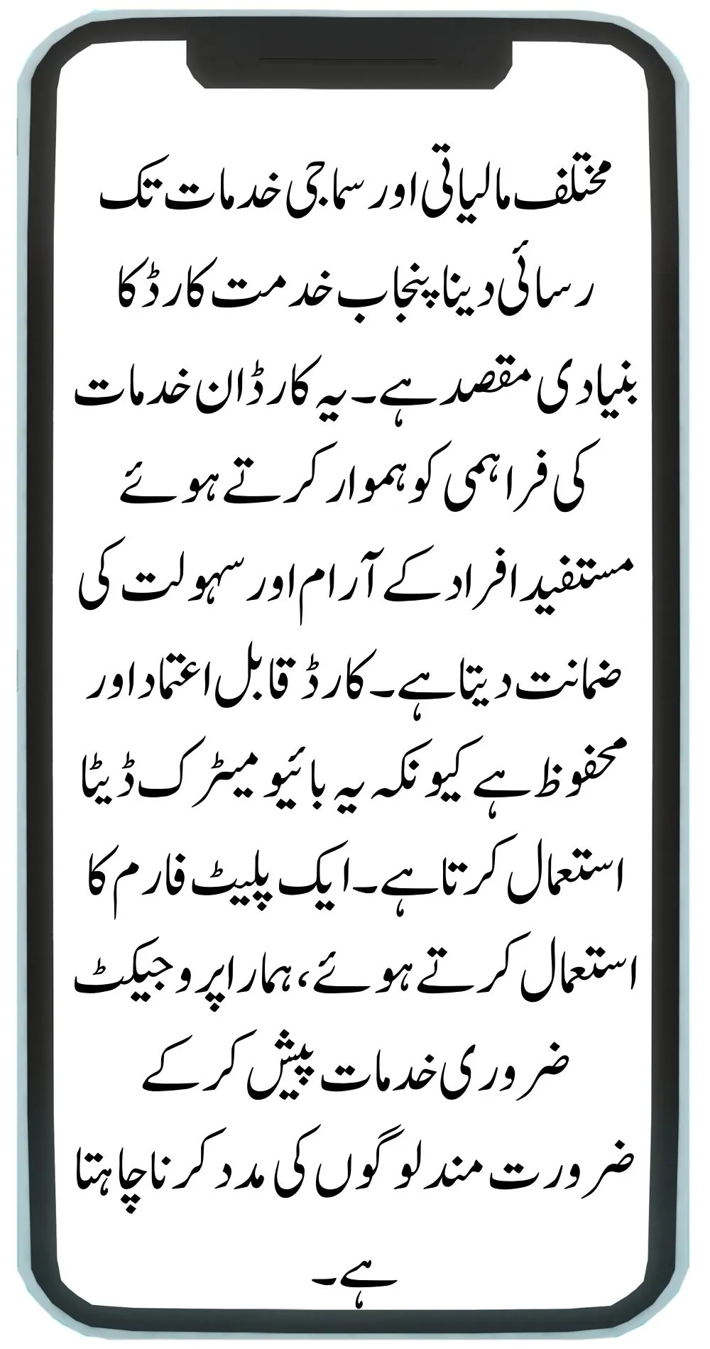 Giving access to different financial and social services is the main objective of the Punjab Khidmat Card. This card guarantees beneficiary comfort and convenience by streamlining the delivery of these services. The card is dependable and safe since it uses biometric data. Using a single platform, our project seeks to assist people in need by offering necessary services.