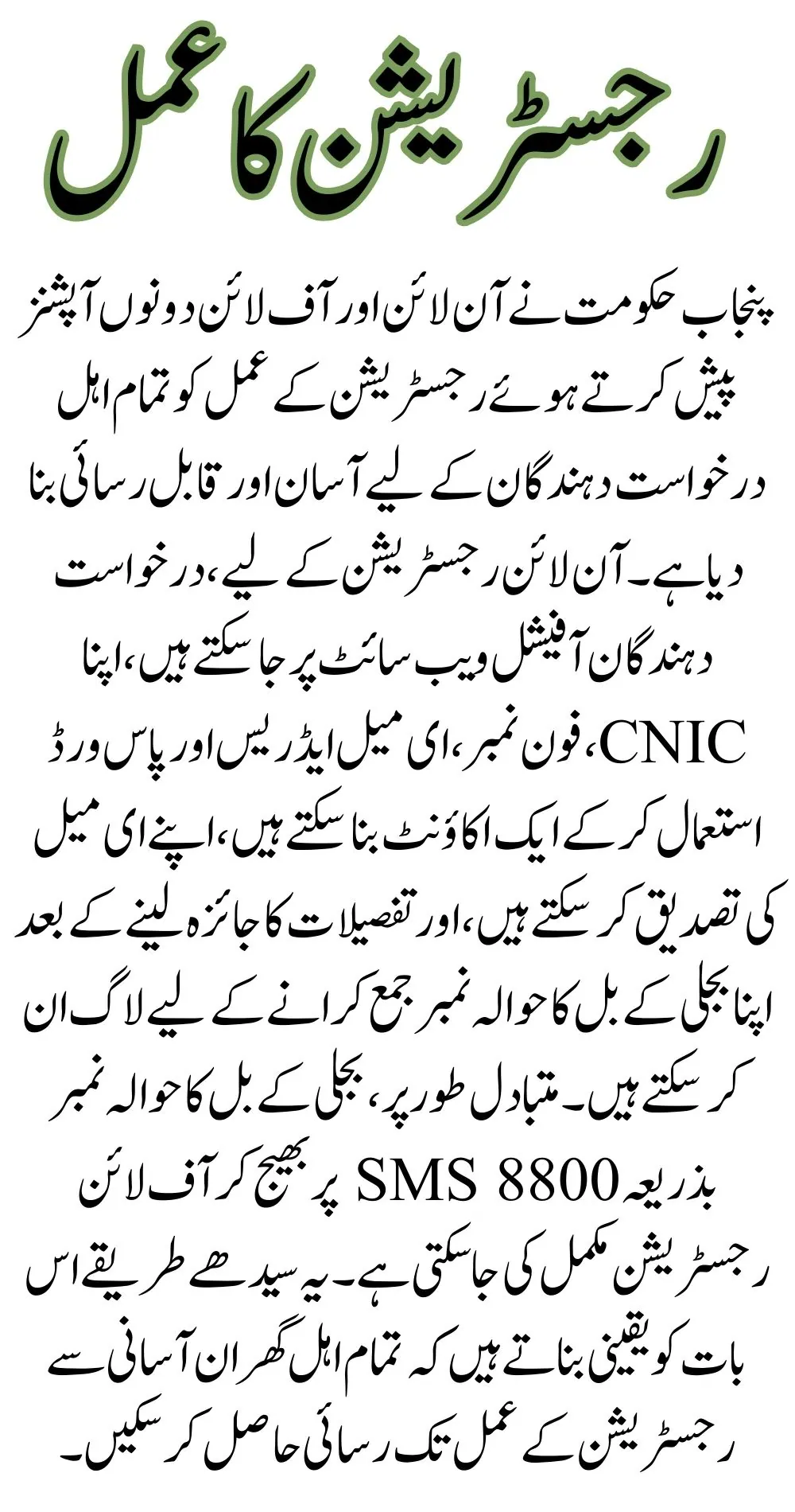 You can register online via the Punjab government’s official website or offline by sending your electricity bill reference number to 8800 via SMS.