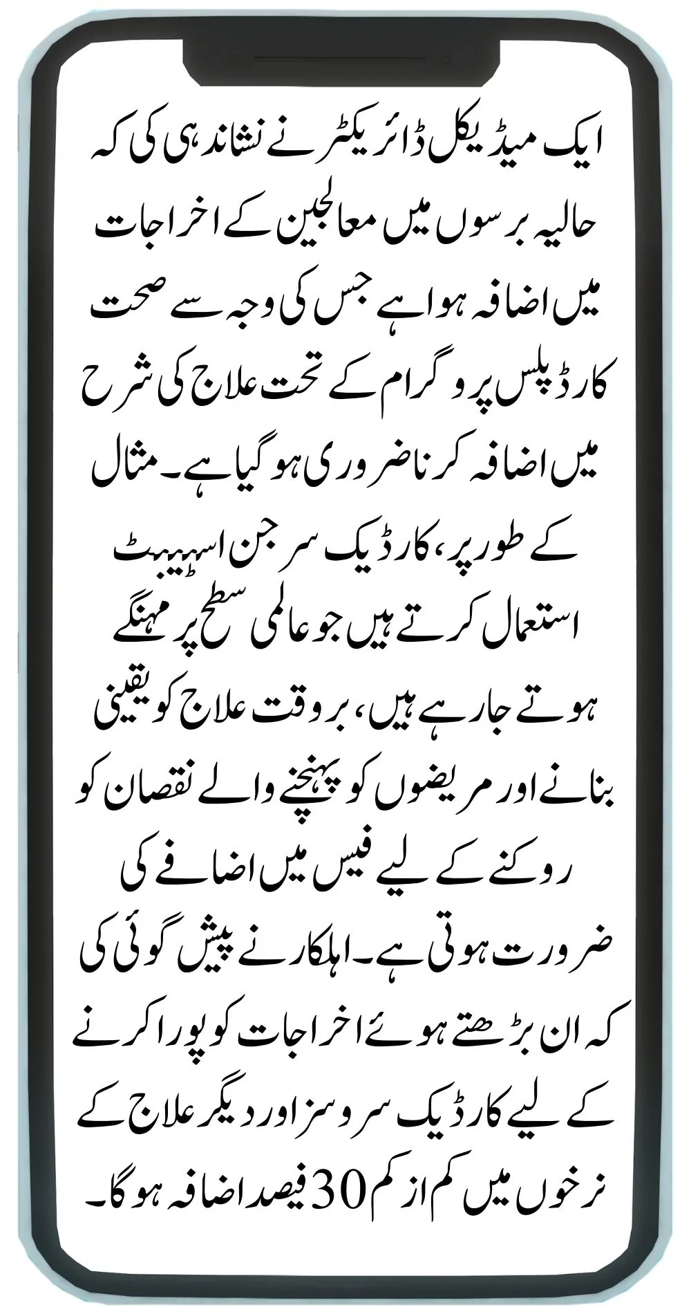 A medical director pointed out that physician costs have increased in recent years, making it necessary to raise treatment rates under the Sehat Card Plus program. For example, cardiac surgeons use stents that are becoming more expensive globally, requiring an increase in fees to ensure timely treatment and prevent harm to patients. The official predicted that rates for cardiac services and other treatments would likely increase by at least 30% to cover these rising costs.
