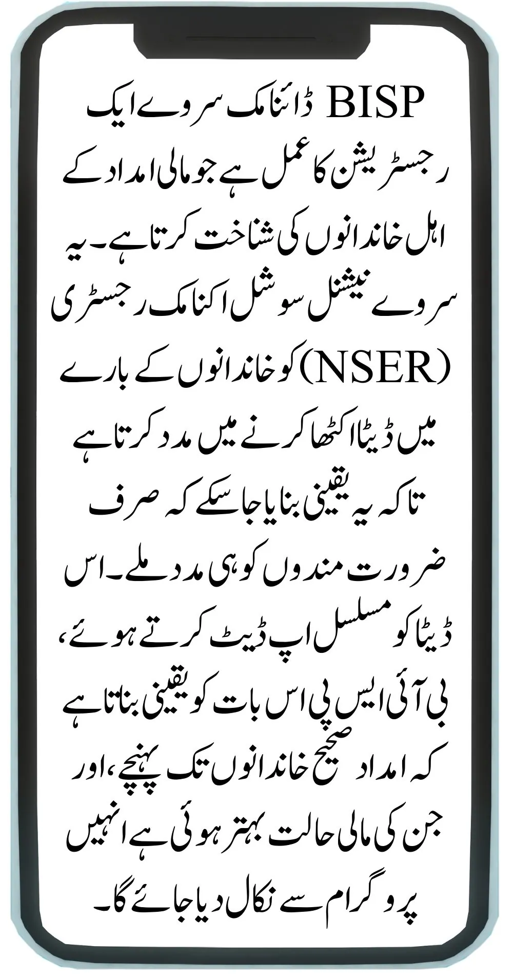 The BISP Dynamic Survey is a registration process that identifies families eligible for financial aid. The survey helps the National Socio-Economic Registry (NSER) collect data about families to ensure that only those in need receive the support. By continuously updating this data, BISP ensures that aid reaches the right families, and those whose financial situation has improved are removed from the program.