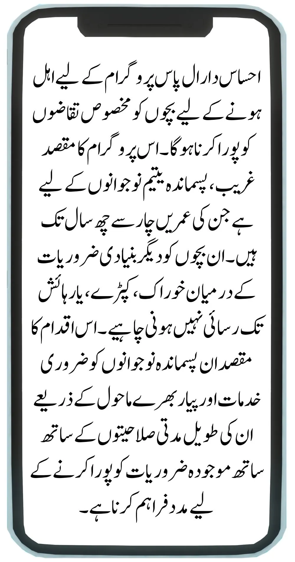 Children have to satisfy particular requirements to be qualified for the Ehsaas Dar Ul Pass Program. The program is meant for impoverished, underprivileged orphaned youngsters ranging in age from four to six. These kids ought not to have access to food, clothes, or shelter among other fundamental needs. The initiative seeks to assist these underprivileged youngsters by means of necessary services and loving surroundings addressing their long-term potential as well as present necessities.