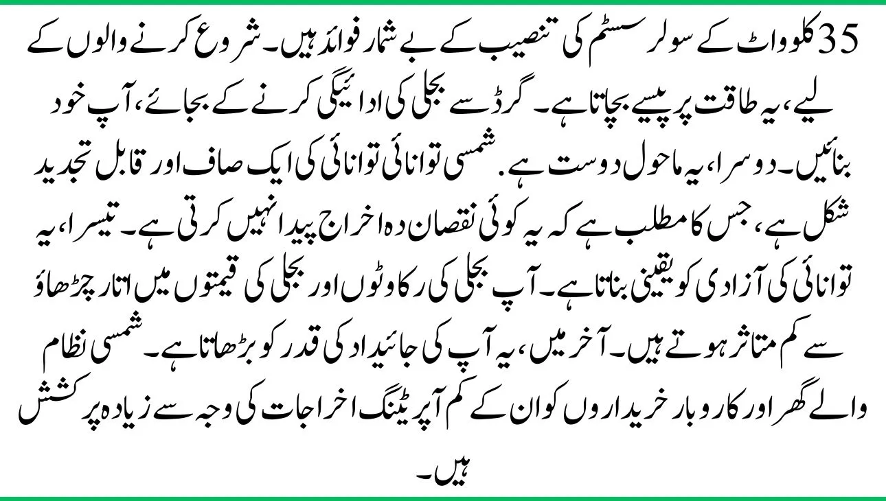 In conclusion, a 35 kW solar system is a highly efficient and environmentally responsible way to generate electricity. It drastically lowers power expenses, gives energy independence, and boosts property value. The system’s components, such as solar panels, inverters, and batteries, work together to provide consistent power. Despite the upfront costs, the long-term savings and low upkeep make it an attractive investment. Choosing the ideal system, as well as assuring proper installation and maintenance, will help you optimize the benefits of solar energy, making it a sustainable option for both residential and commercial buildings.