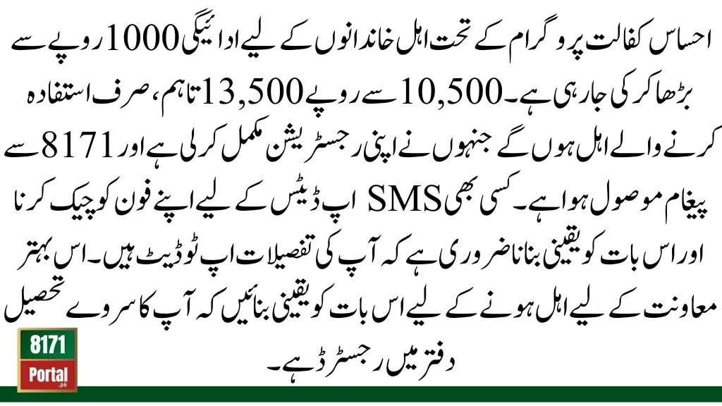 The payment for eligible families under the Ehsaas Kafalat Program is being increased from Rs. 10,500 to Rs. 13,500. However, only beneficiaries who have completed their registration and received a message from 8171 will be eligible. It’s essential to check your phone for any SMS updates and ensure your details are up to date. Make sure your survey is registered at the Tehsil office to qualify for this enhanced support.